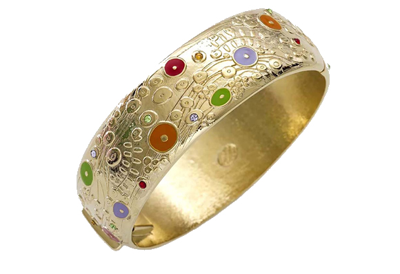 Gustav Klimt esegue nel 1905 lo splendido dipinto finemente sotteso dall’elemento decorativo campito all’interno di superfici dal contorno sinuoso. La sua arte che proietta le figure, soprattutto femminili, in una dimensione atemporale, riflette la sua formazione colta: figlio di un orafo incisore, frequenta la scuola di arti applicate di Vienna. Un viaggio in Italia lo avvicina all’arte bizantina e alle potenzialità dell’uso dell’oro. Ai dettagli raffinatissimi, alla delicata “texture” ed alla variegata tavolozza che descrive le figure della maternità contenuta nel dipinto Le tre età, è ispirata questa collezione di bijoux.