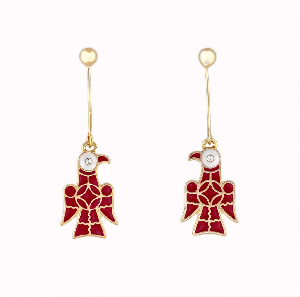 La raffinatezza dell’esecuzione antica è mantenuta negli orecchini: realizzata tutta a mano con smalti stesi in nuance di colore rosso e rosa e incastonatura di pietra crystal che insieme allo smalto bianco valorizzano l’occhio della splendida aquila.