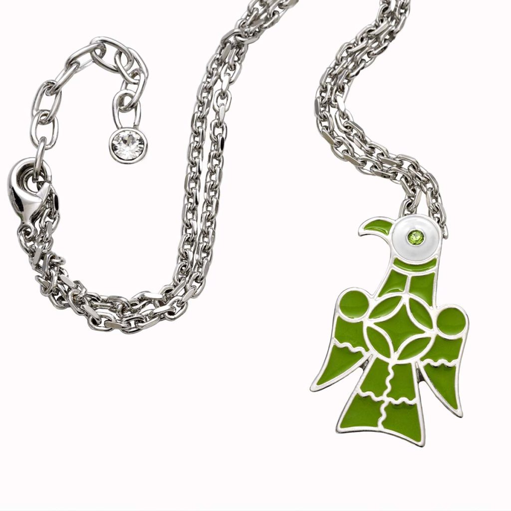 Il pendente è ispirato alla splendida coppia di fibule gote-longobarde rinvenute nello scavo di una sepoltura lungo la via Flaminia in Roma. Ho voluto rendere attuale la fusione dell’oggetto realizzando un bijoux con camere metalliche che possano contenere la stesura di smalti colorati nell’attualizzazione dell’antica tecnica dello smalto cloisonnè chiamata allora anche Lustro di Bisanzio.