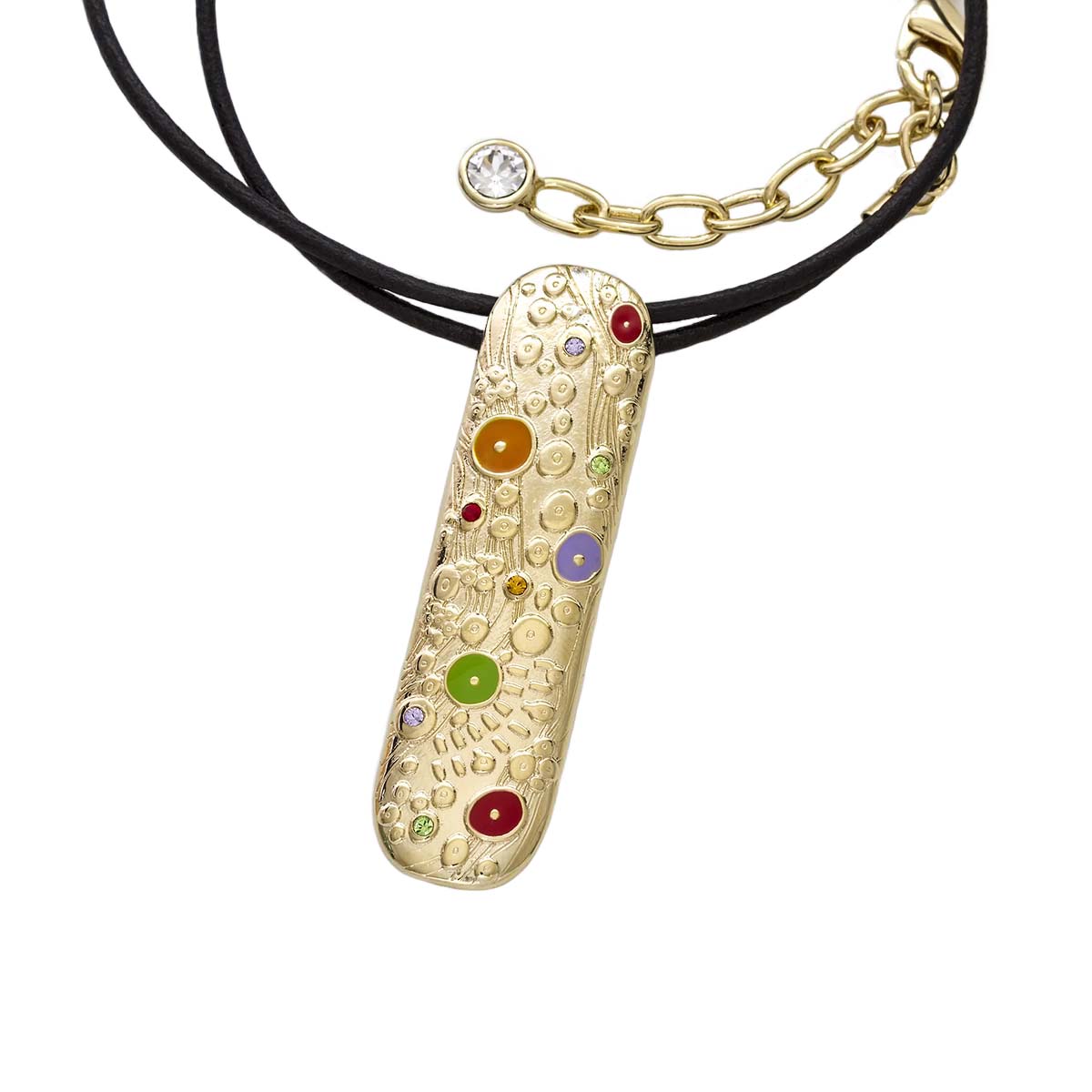 Pendente in lega metallica finitura oro, smalti cloisonné, pietre Swarovski® multicolor, cuoio con terminale allungabile con castone Swarovski® crystal