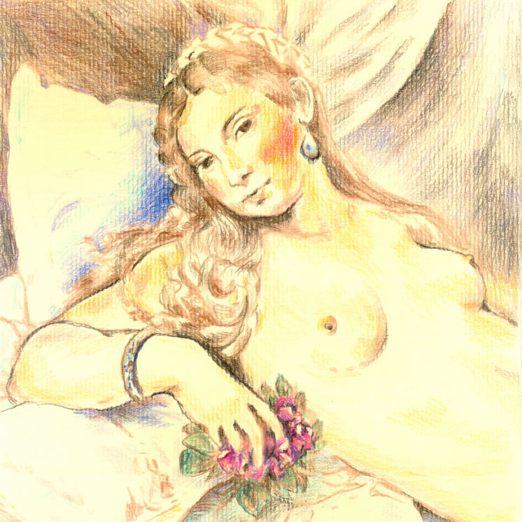 La principessa di Argo, Danae, rinchiusa dal padre Acrisio in una torre di bronzo, nel momento in cui per amore riceve Giove che, per possederla, si trasforma in pioggia d’oro è il mito greco che mi ha, fin da ragazza, tanto attratta nella sua carica erotica così potente. Un dio che per giungere ad amare la segregata e languida principessa, prende una così materiale e preziosa forma….oro sonante…. chissà quale irresistibile desiderio ………..: