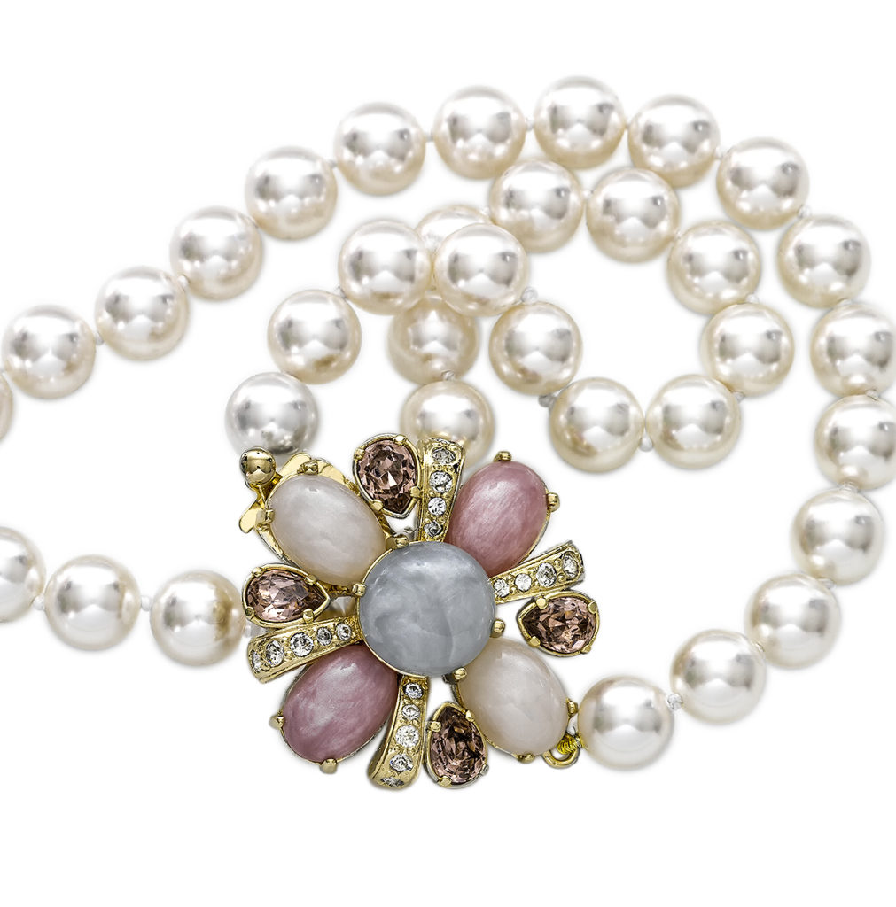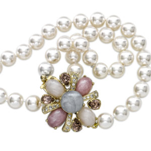 Affacciati alle finestre delle tele ho cercato ed osservato mille e mille volti di uomini e donne: piacevoli, sempre intensi quei viaggi in più spazi e più tempi, dentro musei e gallerie come fossero casa mia, imprescindibili appuntamenti dove ho incontrato popolane e nobildonne, re e diseredati. I loro visi, i loro umani tormenti, le loro passioni, i loro abiti, i loro più preziosi averi ritratti e tramandati ai posteri: al gioiello per antonomasia e a quello Rinascimentale in particolare si ispira questo collier prezioso che le modelle di Tiziano indossano a stretto giro intorno ai candidi e sensuali colli. In questa collezione a loro dedicata ho realizzato un giro di bianche perle impreziosito da chiusura in fusione dorata composita in cristalli e resine dalle gradazioni perlate delle tinte pastello rose, light acquamarine, opal e light ametista.
